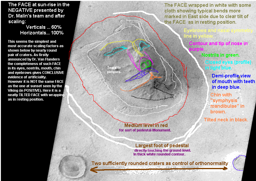 5) Dr. Lahoz published monograph: "Sacred Martian Face = Sagrada Faz Marciana" (UNIAM, dec-2000) explaining in every detail the riddle of the Face, but, unaware of Ignatius' publication, he said in there that Dr. Van Flandern had firstly announced 'conclusive evidence' of Fine-Art (artificiality) in the Face. Now such priority case is here corrected; and the work of Kelly-Fleming-Van Flandern remains moderately respected since the negative was used anyway, even for the wrong purpose of pretending a SYMMETRIC Face-Mesa. Such symmetry is not there as already explained. 6) Dr. Lahoz gave artistic interpretation of both intended Art-Faces (sunset and sunrise respectively). Above picture does not need more comments. There is, conclusively, extraordinary Fine-Art and Craft in the Face-mesa. |
